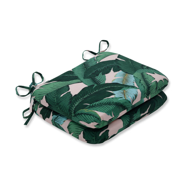 Bring the tropics home with this set of two outdoor seat cushions. Their bold, tropical pattern has large palm leaves in vibrant shades of green and turquoise. The palm leaves pop against the soft pastel pink ground for an updated, fresh look. Additional features of these outdoor seat cushions include rounded corners, 14" ties and recycled polyester fill with sewn seam closures. Also suitable for indoor use.