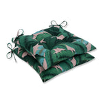 Bring the tropics home with this set of two outdoor tufted chair cushions. Their bold, tropical pattern has large palm leaves in vibrant shades of green and turquoise. The palm leaves pop against the soft pastel pink ground for an updated, fresh look. Additional features of these outdoor tufted chair cushions include 14" ties and recycled polyester fiber fill with sewn seam closures. Also suitable for indoor use.
