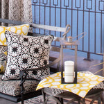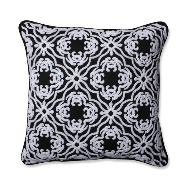 Update the look of your backyard furniture with the bold color and plush, elegant embroidery of this gorgeous outdoor decorative pillow. Geometric tile inspired designs made from cuddly soft, cloud-like white boucle thread fill the front of this ebony black throw pillow. The back of this pillow is made from the same richly colored fabric as the front, without the embroidery, which gives this pillow a classic feel and makes it easy to coordinate with any decor. Additional features of this outdoor decorative pillow include a coordinating welt cord for a clean finish and recycled polyester fiber fill with a sewn seam closure. Also suitable for indoor use.