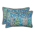 Enliven your patio decor with this set of two irresistible outdoor lumbar pillows. Their contemporary painterly pattern is inspired from raindrops. In tranquil shades of turquoise, green, blue and gray, the design is set against an off-white ground. Additional features of these outdoor lumbar pillows include coordinating welt cords for a clean finish and recycled polyester fiber fill with sewn seam closures. Also suitable for indoor use.