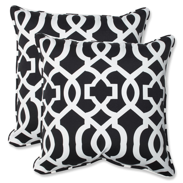 The black and white design of this set of two outdoor decorative pillows grips your attention with elegance. On a black ground, their interlocking white geometric pattern contrasts beautifully on the fade resistant fabric for a modern look. Additional features of these outdoor decorative pillows include self welt cords for a clean finish and recycled polyester fiber fill with sewn seam closures. Also suitable for indoor use.