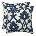 Trendy navy blue adds a modern twist to the classic and sophisticated damask pattern of this set of two outdoor throw pillows. Durable fabric and brilliant, fade-resistant colors make this set equally at home on indoor or outdoor furniture. Resilient and long-lasting, these pillows are ideal for living room couches or patios. Additional features of this set of two outdoor decorative pillows include self welt cords for a beautiful finish and recycled polyester fiber fill with sewn seam closures.