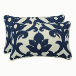 Damask becomes a work of art on this set of two outdoor lumbar pillows. The classic design is given a softer makeover in blue strokes on each pillow's crisp white ground. Brilliant, fade-resistant colors stay true on the durable and resilient material. Ideal for use indoors in living rooms or bedrooms as well as on outdoor patio sets. Additional features of this set of two outdoor lumbar pillows include self welt cords for a beautiful finish and recycled polyester fiber fill with sewn seam closures.