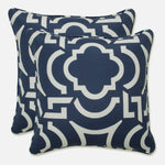 Oversized white graphics on a navy ground mean you have a set of two outdoor throw pillows with flair. They'll stay bold with their UV-protected polyester fabric. Accent your outdoor furniture with this set and enjoy how they immediately grab attention. And attention-grabbing doesn't mean uncomfortable. Cuddle up with these pillows and you'll realize how cozy they are. Spot cleaning is all that's needed to maintain them. Additional features of these outdoor decorative pillows include self welt cords for a beautiful finish and recycled polyester fiber fill with sewn seam closures. Also suitable for indoor use.