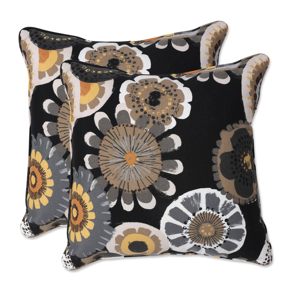 Delight in the painterly beauty of this set of two outdoor throw pillows. A mix of flowers in neutral shades of gold, tan, brown, gray and off-white pop from a classic black ground. Additional features of these outdoor throw pillows include self welt cords for a beautiful finish and recycled polyester fiber fill with sewn seam closures. Also suitable for indoor use.