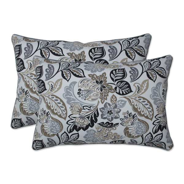 Floral prints never go out of season. This set of two outdoor oversized lumbar pillows is a timeless choice for a fresh, new look outside. In neutral shades of tan, gray and black, this perfectly-sized floral pops against the off-white ground. You'll love the clean look for a casual outdoor setting. Additional features of these outdoor oversized lumbar pillows include coordinating welt cords for a clean finish and recycled polyester fiber fill with sewn seam closures. Also suitable for indoor use.