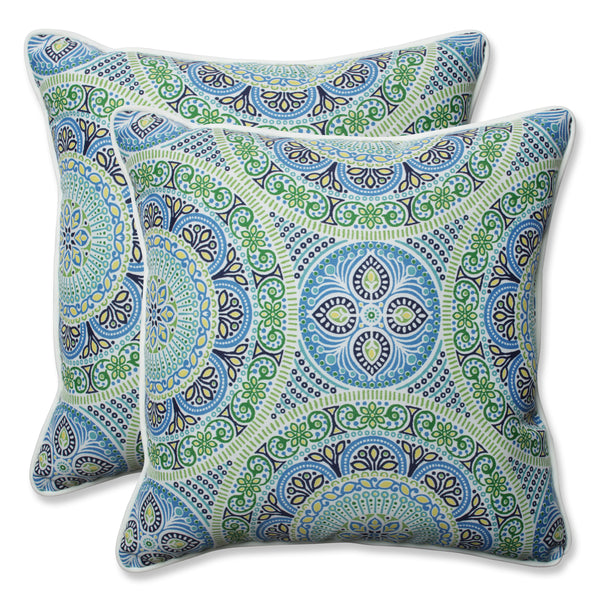 Accent your patio with the intricate, artful elegance of this set of two outdoor decorative pillows. Their detailed Suzani print pattern with delicately embellished circles is in enchanting shades of blue, green and yellow set on a white ground. Additional features of these outdoor decorative pillows include coordinating white welt cords for a clean finish and recycled polyester fiber fill with sewn seam closures. Also suitable for indoor use.