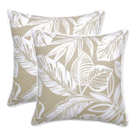 Oversized white leaves tell a monochromatic story on a natural ground with this set of two outdoor throw pillows. The pattern is printed on outdoor fade-resistant polyester fabric that has a slub texture for added dimension. Additional features of these outdoor throw pillows include white coordinating welt cords for a clean finish and recycled polyester fiber fill with sewn seam closures. Also suitable for indoor use.