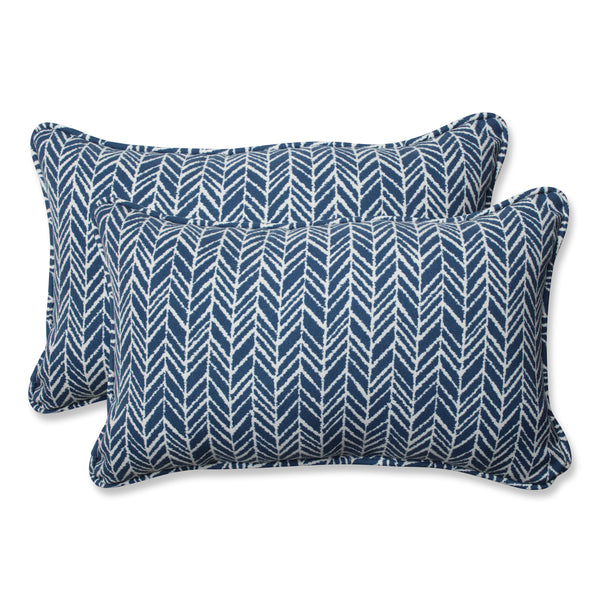 The rustic appeal of this set of two outdoor lumbar pillows is perfect for creating a casual outdoor escape. With a dimensional look, their eye-catching herringbone pattern is in an off-white set against a dark blue ground. Additional features of these outdoor lumbar pillows include self welt cords for a beautiful finish and recycled polyester fiber fill with sewn seam closures. Also suitable for indoor use.
