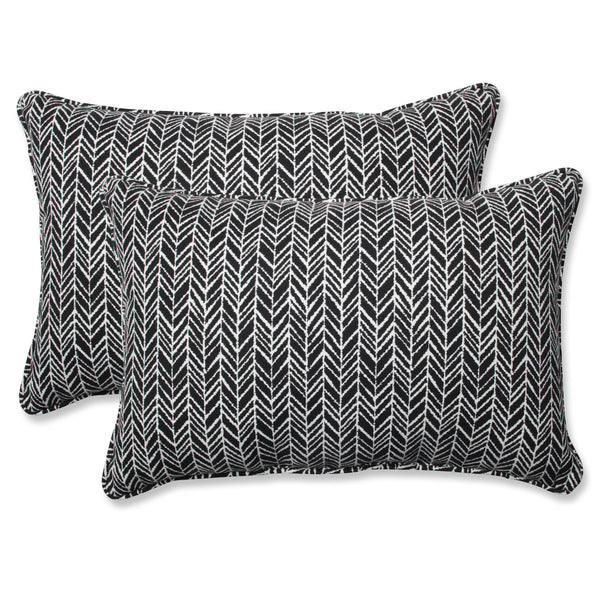 The on-trend appeal of this set of two outdoor oversized lumbar pillows is ideal for creating a casual outdoor escape. Their eye-catching herringbone pattern is in an off-white set against a black ground, which is perfect for complementing other decor. Additional features of these outdoor oversized lumbar pillows include self welt cords for a beautiful finish and recycled polyester fiber fill with sewn seam closures. Also suitable for indoor use.