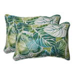 Accent your patio or deck in the gorgeous look of a tropical rainforest with this set of two outdoor oversized lumbar pillows. Their leafy print pattern, in watercolor shades of green and blue with white outlined leaves, covers the linen textured fabric. Additional features of these outdoor oversized lumbar pillows include self welt cords for a clean finish and recycled polyester fiber fill with sewn seam closures. Also suitable for indoor use.