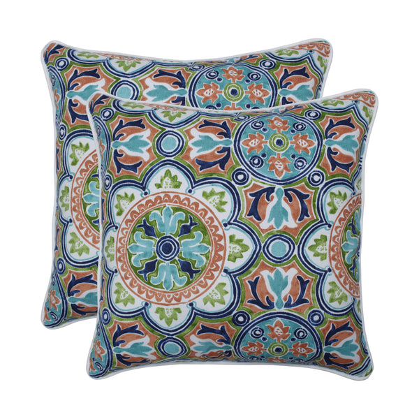 Brighten outdoor living space with this set of two outdoor decorative pillows. Their stylized geometric figures in contemporary shapes create a non-directional pattern. Shades of indigo, turquoise, terra-cotta and green make up their eye-catching pattern. Additional features of these outdoor decorative pillows include coordinating white welt cords for a clean finish and recycled polyester fiber fill with sewn seam closures. Also suitable for indoor use.