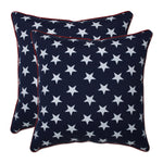 This set of two outdoor throw pillows features a navy blue ground with crisp, white stars. This classic, Americana print gives this pattern a casual feel for any outdoor decor. Additional features of these outdoor throw pillows include red contrasting welt cords for a clean finish and recycled polyester fiber fill with sewn seam closures. Also suitable for indoor use.