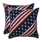 This set of two outdoor decorative pillows is accented with a distressed Americana diagonal striped pattern. The printed stars and stripes in patriotic colors of red, white and blue, give this pattern a casual feel for any outdoor decor. Additional features of these outdoor decorative pillows include white contrast welt cords for a clean finish and recycled polyester fiber fill with sewn seam closures. Also suitable for indoor use.