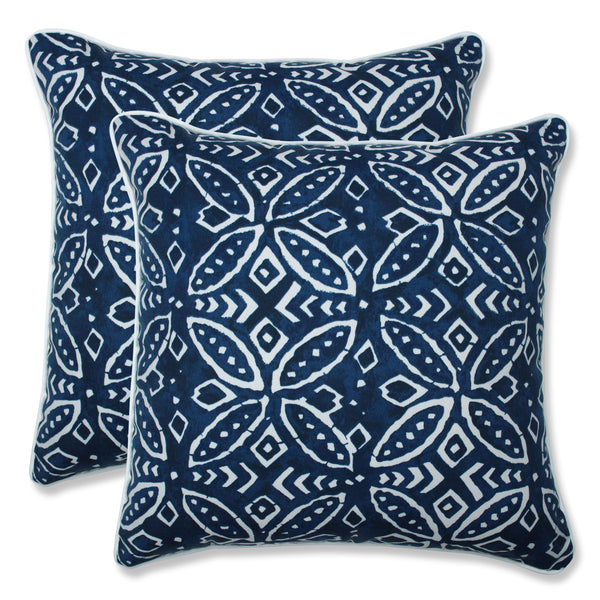 This globally inspired design offers a perfect welcome printed on this set of two outdoor decorative pillows. Inspired from block printed designs, the repetitive pattern has petal-like shapes in off-white set against a traditional indigo blue ground, a perfect accent for a cosmopolitan outdoor living space. Made of 100% polyester. Additional features of these outdoor decorative pillows include white coordinating welt cords for a clean finish and recycled polyester fiber fill with sewn seam closures. Also suitable for indoor use.