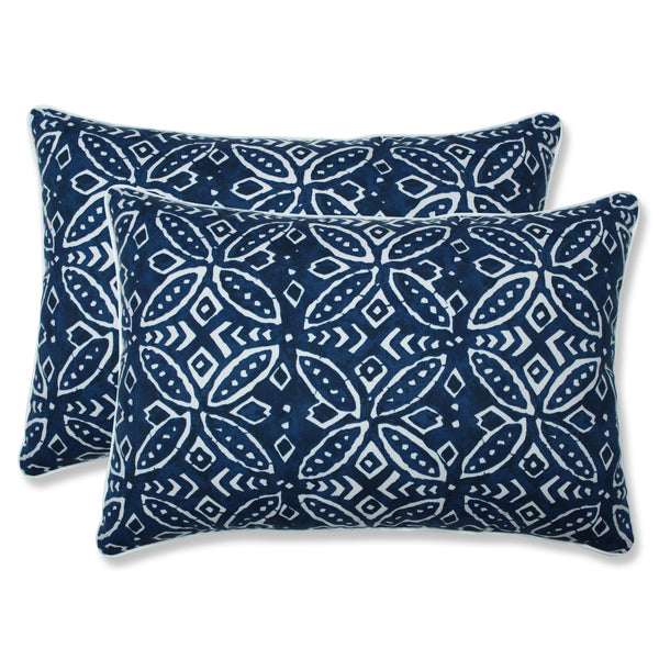 This globally inspired design offers a perfect welcome printed on this set of two outdoor oversized lumbar pillows. Inspired from block printed designs, the repetitive pattern has petal-like shapes in off-white set against a traditional indigo blue ground, a perfect accent for a cosmopolitan outdoor living space. Made of 100% polyester. Additional features of these outdoor oversized lumbar pillows include white coordinating welt cords for a clean finish and recycled polyester fiber fill with sewn seam closures. Also suitable for indoor use.