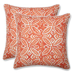This globally inspired design provides a perfect welcome printed on this set of two outdoor decorative pillows. Inspired from block printed designs, their repetitive pattern has petal-like shapes in off-white set against a ground in shades of orange, perfect for accenting a cosmopolitan outdoor living space. Made of 100% polyester. Additional features of these outdoor decorative pillows include white coordinating welt cords for a clean finish and recycled polyester fiber fill with sewn seam closures. Also suitable for indoor use.