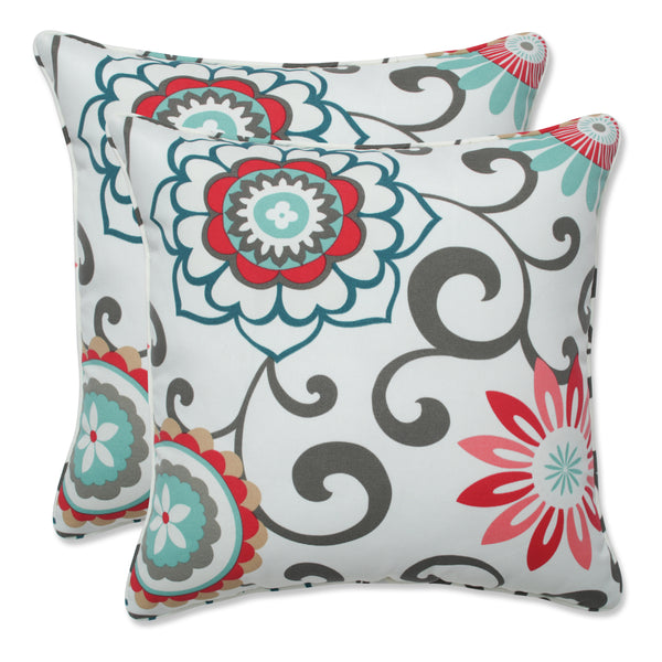 Style blooms with the fun floral pattern of this set of two outdoor throw pillows. Multicolored flowers in shades of blue, gray, orange, tan and red are set on an off-white ground surrounded with curling vines in a shade of dark gray. This versatile pattern easily pairs with light or dark furniture. Additional features of these outdoor throw pillows include self welt cords for a clean finish and recycled polyester fiber fill with sewn seam closures. Also suitable for indoor use.