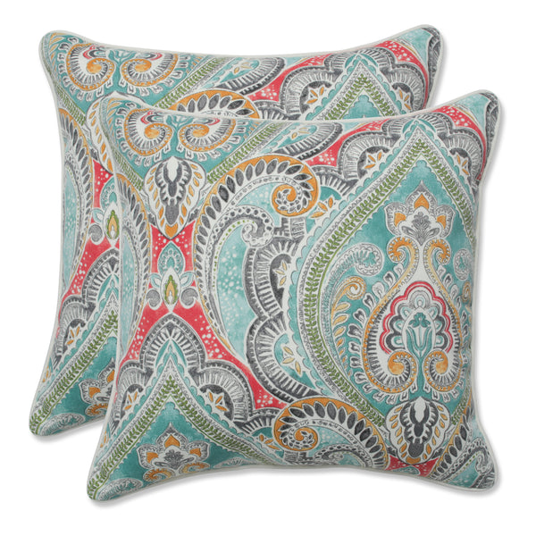 Make your patio the epitome of elegance with the paisley pattern of this set of two outdoor throw pillows. Their intricate design is in lovely shades of coral, turquoise, green, yellow and gray, which emphasize every detail for a worldly look. Additional features of these outdoor throw pillows include white contrasting welt cords for a clean finish and recycled polyester fiber fill with sewn seam closures. Also suitable for indoor use.