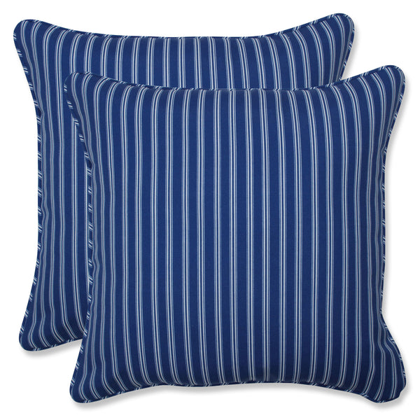 Relax in the classic style of this attractive and inviting updated blue and white ticking stripe. The sharp looking, on-trend pattern of this set of two outdoor throw pillows shows a new wider stripe between the smaller ticking stripes. A perfect update to go with those farmhouse living spaces. Made of 100% polyester. Additional features of these outdoor throw pillows include self welt cords for a clean finish and recycled polyester fiber fill with sewn seam closures. Also suitable for indoor use.