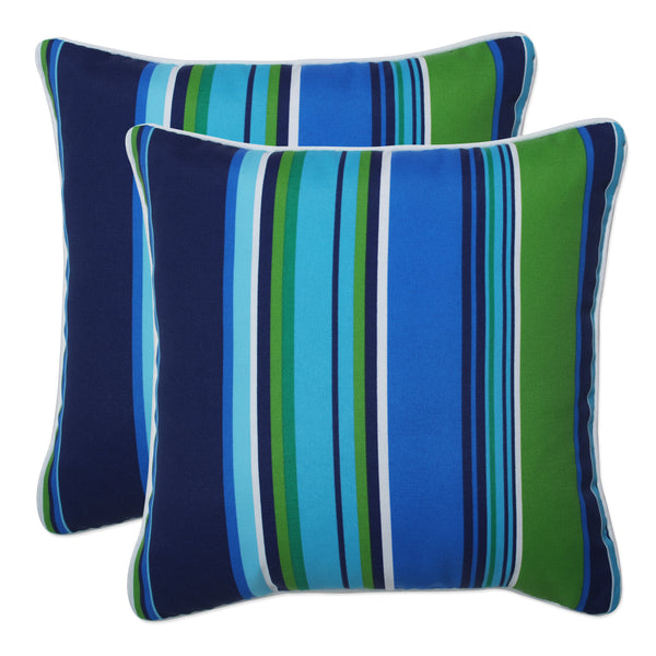 This set of two outdoor throw pillows features an unbalanced stripe printed in bright shades of blue, green and white. They will make a striking statement in any outdoor space. Additional features of these outdoor throw pillows include white contrasting cords for a clean finish and recycled polyester fiber fill with sewn seam closures. Also suitable for indoor use.
