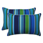 This set of two outdoor oversized lumbar pillows features an unbalanced stripe printed in bright shades of blue, green and white. They will make a striking statement in any outdoor space. Additional features of these outdoor oversized lumbar pillows include white contrasting cords for a clean finish and recycled polyester fiber fill with sewn seam closures. Also suitable for indoor use.