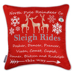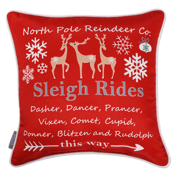 Welcome your guests to the North Pole…or your home. The Pillow Perfect Christmas Outdoor/Indoor Reversible Throw Pillow in Red Sleigh Rides "advertises" the North Pole Reindeer Co, where you can catch a sleigh ride with some of Santa's favorites. Flip over this UV-rated pillow to find rows of festive reindeers gathered ready to depart. Display it on your front porch, bench, or in your entryway. The pillow's plush recycled polyester fill will hold its shape so you can enjoy it year after year. Spot clean as needed using mild detergent and let air dry.