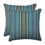 Easily transform porches and patios with this set of two outdoor decorative pillows featuring a classic, yet modern, bold stripe. Crisp, tranquil shades of blue, green and natural are accented with a fine chevron printed in the ground, which creates added visual interest and uniqueness for this casual stripe. Additional features of these outdoor decorative pillows include self welt cords for a clean finish and recycled polyester fiber fill with sewn seam closures. Also suitable for indoor use.