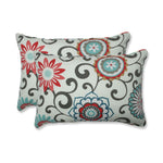 Style blooms with the fun floral pattern of this set of two outdoor oversized lumbar pillows. Multicolored flowers in shades of blue, gray, orange, tan and red are set on an off-white ground surrounded with curling vines in a shade of dark gray. This versatile pattern easily pairs with light or dark furniture. Additional features of these outdoor oversized lumbar pillows include self welt cords for a clean finish and recycled polyester fiber fill with sewn seam closures. Also suitable for indoor use.