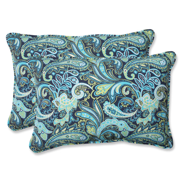 The gorgeous fashion and bright, coordinating hues of this set of two outdoor oversized lumbar pillows bring elegance to any outdoor area. In the hot, on-trend paisley pattern, shimmering shades of aqua blue, navy blue, green and off-white create a cool style. Additional features of these outdoor oversized lumbar pillows include self welt cords for a clean finish and recycled polyester fiber fill with sewn seam closures. Also suitable for indoor use.