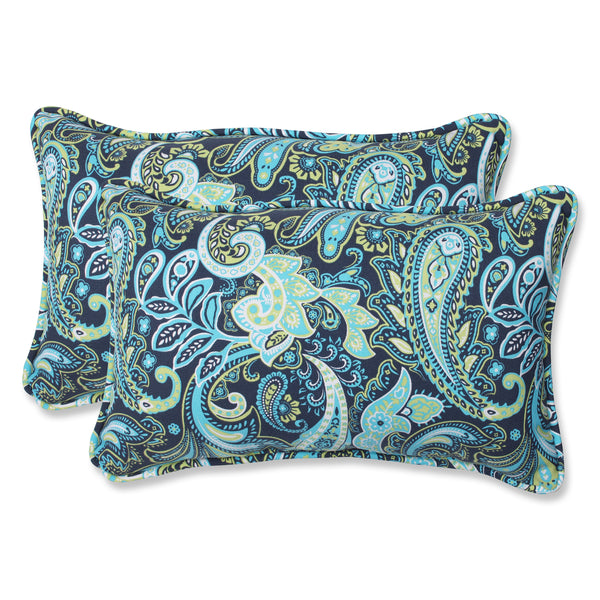 The gorgeous fashion and bright, coordinating hues of this set of two outdoor lumbar pillows bring elegance to any outdoor area. In the hot, on-trend paisley pattern, shimmering shades of aqua blue, navy blue, green and off-white create a cool style. Additional features of these outdoor lumbar pillows include self welt cords for a clean finish and recycled polyester fiber fill with sewn seam closures. Also suitable for indoor use.