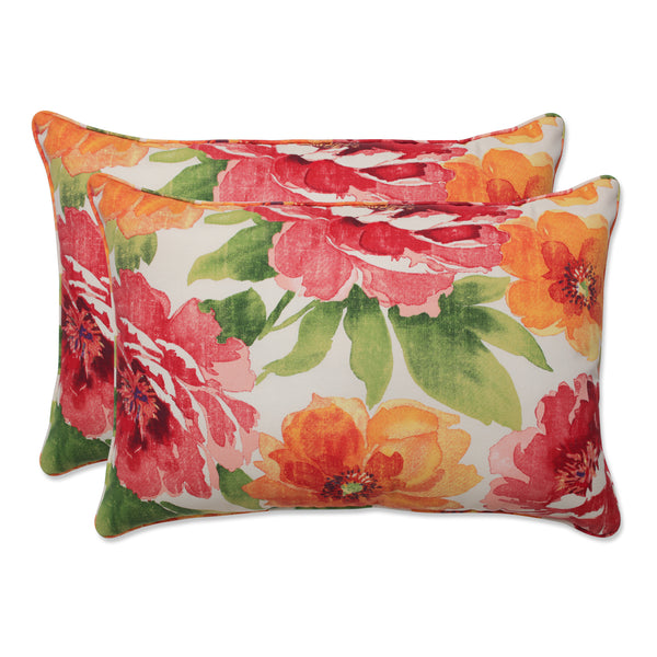 Add ambiance to your porch with the gorgeous flair of this set of two outdoor oversized lumbar pillows. Their watercolor pattern with large-scale, detailed flowers is in shades of red and orange on an off-white ground. Fabric is durable and fade resistant. Additional features of these outdoor lumbar pillows include self welt cords for a clean finish and recycled polyester fiber fill with sewn seam closures. Also suitable for indoor use.