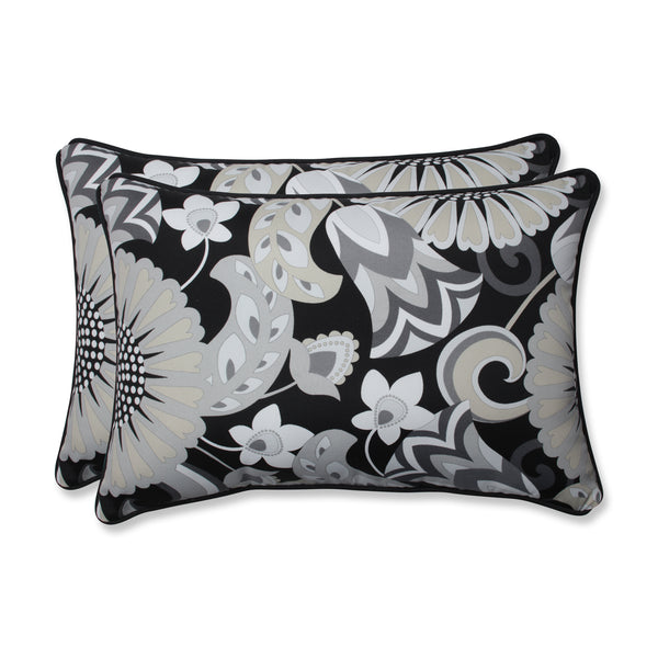 Create a welcoming new style for your patio or porch with this set of two bold and beautiful outdoor oversized lumbar pillows. Their elegant floral pattern is modern in soothing shades of gray and taupe set against a black ground. Additional features of these outdoor oversized lumbar pillows include black coordinating welt cords for a beautiful finish and recycled polyester fiber fill with sewn seam closures. Also suitable for indoor use.
