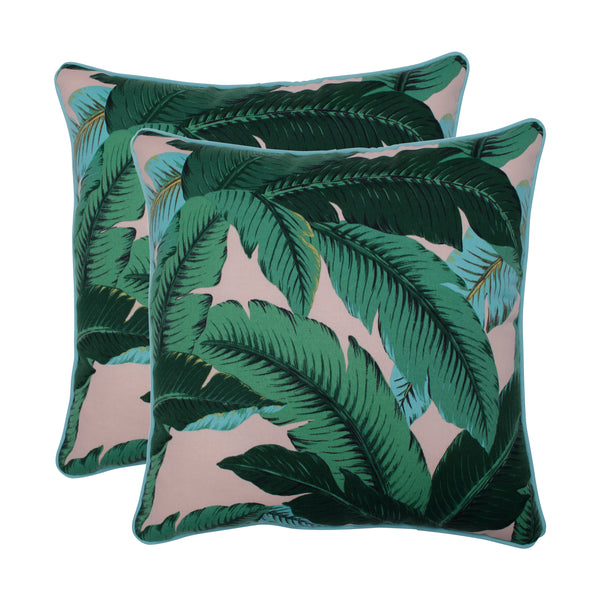 Bring the tropics home with this set of two outdoor decorative pillows. Their bold, tropical pattern has large palm leaves in vibrant shades of green and turquoise. The palm leaves pop against the soft pastel pink ground for an updated, fresh look. Additional features of these outdoor decorative pillows include blue coordinating welt cords for a clean finish and recycled polyester fiber fill with sewn seam closures. Also suitable for indoor use.