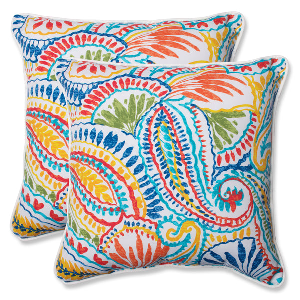 Give your patio or porch an intense splash of color with the hot paisley fabric pattern of this stylish set of two outdoor decorative pillows. Their bold print design is set on a white ground in bright shades of blue, green, orange, red and yellow, perfect spicing up your outdoor ensemble. Made of 100% polyester fade-resistant fabric. Additional features of these outdoor decorative pillows include white coordinating welt cords for a beautiful finish and recycled polyester fiber fill with sewn seam closures. Also suitable for indoor use.