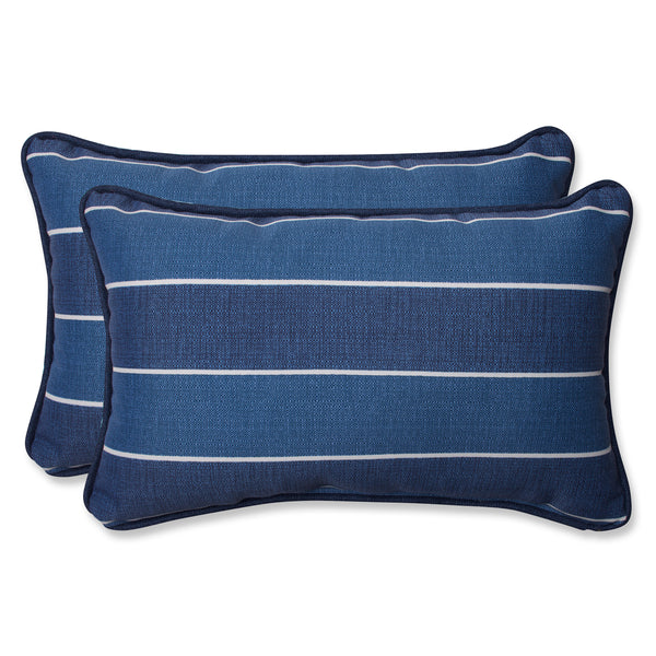 Add a classy touch to your porch or patio with the sharp look of this set of two outdoor lumbar pillows. With a linen-like fabric texture, their bold stripes are in two alternating shades of blue and highlighted with thin white stripes. Made of 100% polyester fade-resistant fabric. Additional features of these outdoor lumbar pillows include coordinating navy blue cords for a clean finish and recycled polyester fiber fill with sewn seam closures. Also suitable for indoor use.