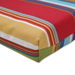 Give your patio a lively, festival-like style with the flattering awning stripes of this outdoor chaise lounge cushion. Ideal for brightening dark areas, its uneven striped pattern is in hot shades of red, yellow, green and blue. Made of 100% polyester fade-resistant fabric. Additional features of this outdoor chaise lounge cushion include 14" ties to secure the cushion to your furniture, square corners and recycled polyester fill with a sewn seam closure.