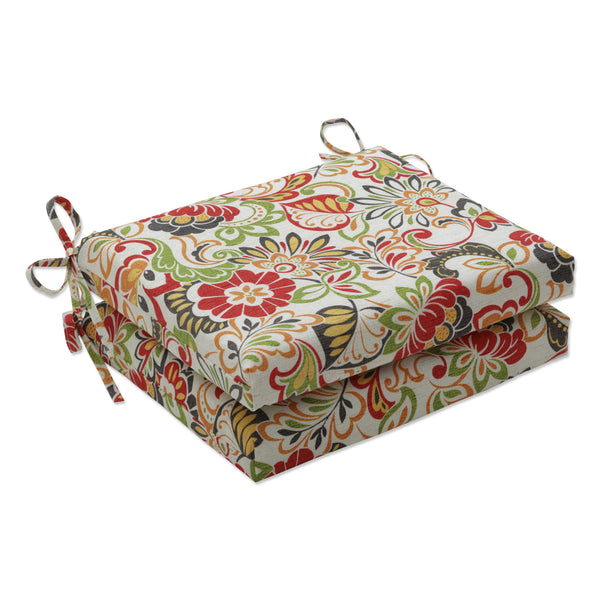 Bring elegant Jacobean style to your patio with this set of two outdoor seat cushions. Their floral print pattern in shades of red, orange, green and dark gray is set on an off-white ground. Fabric is textured and fade resistant. Additional features of these outdoor seat cushions include square corners, 14" ties and recycled polyester fill with zippered closures for easy removal. Also suitable for indoor use.