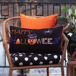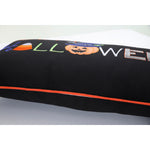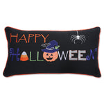 Spell out Halloween fun with this season's greeting. Appliqued and embroidered letters, symbols, and seasonal motifs sparkle, spook, and pop off the black ground to create a delightful and irresistible contrast. Colored in the season's hues of orange, white, purple, green, and metallic silver, this Happy Halloween lumbar pillow sets the scene, transforming from everyday looks with its captivating dimension. Additional features include a coordinating orange welt cord, pillow insert containing recycled polyester fiber fill and a zipper closure.