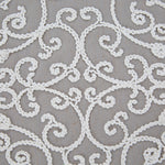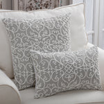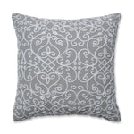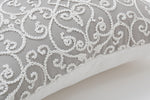 This dimensional decorative pillow laces pearl-like embroidery over a gray backdrop for an aura of sparkling elegance. An appliqued cord forms a scroll pattern that adds valuable surface dimension. Hints of metallic accents embed in the design to catch surrounding light. Additional features include a knife edge seam and a 95% feather/5% down pillow insert with a sewn seam closure.