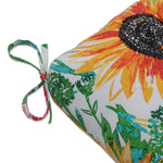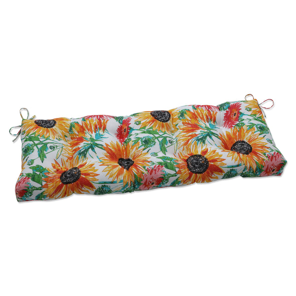 Bold bursts of sunflowers pop from this outdoor bench cushion creating a refreshing look for your outdoors. Substantial blooms and foliage in vivid shades of yellow, orange, green, blue and pink pop from the crisp white ground. A soft distressing adds artist-intended imperfections and character. Additional features of this outdoor bench cushion include tufted detailing, 14" ties and recycled polyester fiber fill with a sewn seam closure. Also suitable for indoor use.