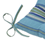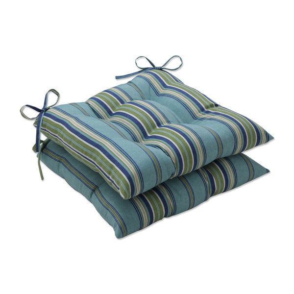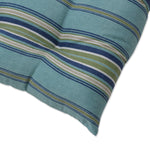 Easily transform porches and patios with this set of two outdoor tufted chair cushions featuring a classic, yet modern, bold stripe. Crisp, tranquil shades of blue, green and natural are accented with a fine chevron printed in the ground, which creates added visual interest and uniqueness for this casual stripe. Additional features of these outdoor tufted chair cushions include 14" ties and recycled polyester fiber fill with sewn seam closures. Also suitable for indoor use.