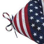 This outdoor bench cushion is accented with a distressed Americana diagonal striped pattern. The printed stars and stripes in patriotic colors of red, white and blue, give this pattern a casual feel for any outdoor decor. Additional features of this outdoor bench cushion include tufted detailing, 14" ties and recycled polyester fiber fill with a sewn seam closure. Also suitable for indoor use.