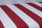This large outdoor bench cushion features a classic cabana stripe. Printed in red and white, the two-inch wide stripes give this pattern a casual feel for any outdoor decor. Additional features of this large outdoor bench cushion include tufted detailing, 14" ties and recycled polyester fiber fill with a sewn seam closure. Also suitable for indoor use.