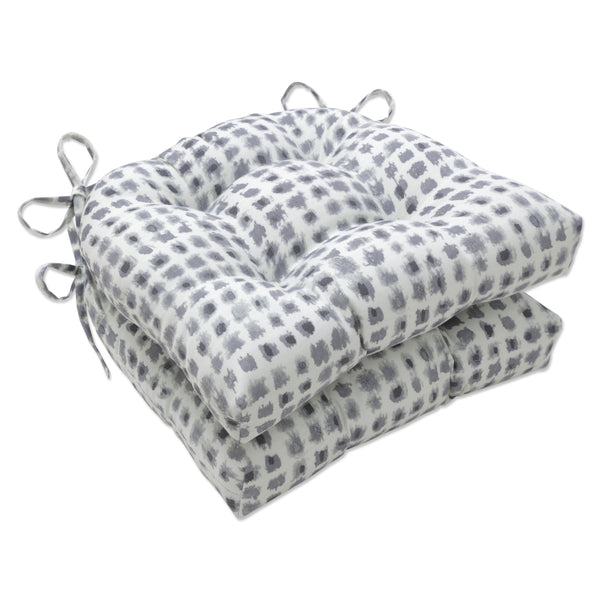 The modern pattern of this set of two large outdoor tufted chair pads resembles a watercolor dot. This essential print has layered shades of gray atop an off-white ground creating printed dimension and texture. They're a must-have addition that plays well with all patterns and prints. Additional features of these large outdoor tufted chair pads include 14" ties to secure the cushions to your furniture and recycled polyester fiber fill with sewn seam closures. Also suitable for indoor use in kitchen and dining areas.
