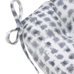 The modern pattern of this set of two outdoor tufted chair pads resembles a watercolor dot. This essential print has layered shades of gray atop an off-white ground creating printed dimension and texture. They're a must-have addition that plays well with all patterns and prints. Additional features of these outdoor tufted chair pads include 14" ties to secure the cushions to your furniture and recycled polyester fiber fill with sewn seam closures. Also suitable for indoor use in kitchen and dining areas.