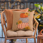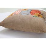 Harvest icons of shapely gourds and sunflowers create a warm welcome to the autumn season. This Thanksgiving Pumpkins throw pillow is appliqued and embroidered in rich fall colors with nubby textures and patterns atop a burlap ground for rustic dimension. Additional features include a knife edge seam for a clean finish and recycled polyester fiber fill with a sewn seam closure.
