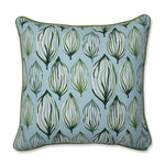 Add a cool touch of relaxation to your decor with a decorative pillow in a distinctive, soothing design. Its painterely green leafy vertical pattern over an off-white is delicate and set against an aqua ground. Made from 100% cotton. Additional features of this decorative pillow include a coordinating green welt cord for a clean finish and recycled polyester fiber fill with a sewn seam closure.