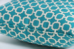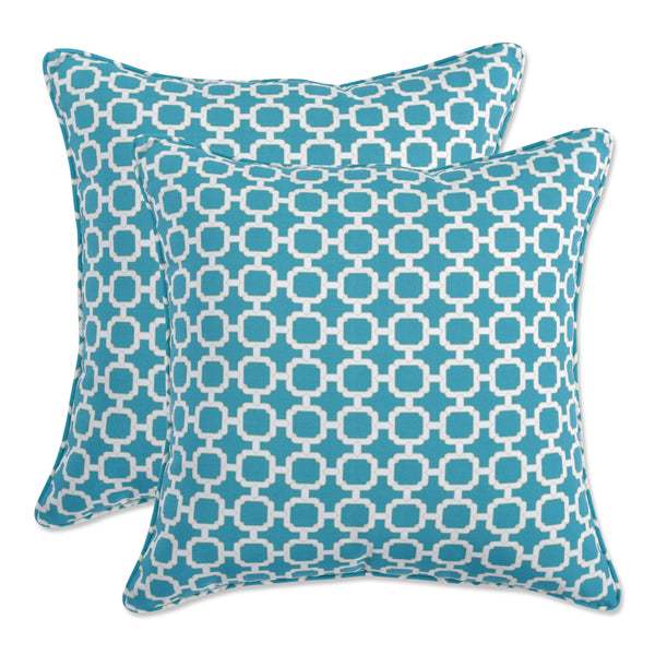 Update any outdoor area with this set of two on-trend geometric patterned outdoor decorative pillows. For a modern effect, their off-white linking pattern pops from a background that's in a shade of teal. Fabric is durable and fade resistant. Additional features of these outdoor decorative pillows include self welt cords for a clean finish and recycled polyester fiber fill with sewn seam closures. Also suitable for indoor use.