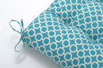 Update any outdoor area with this on-trend geometric patterned outdoor bench cushion. For a modern effect, its off-white linking pattern pops from a background that's in a shade of teal. Fabric is durable and fade resistant. Additional features of this outdoor bench cushion include tufted detailing, 14" ties and recycled polyester fiber fill with a sewn seam closure. Also suitable for indoor use.